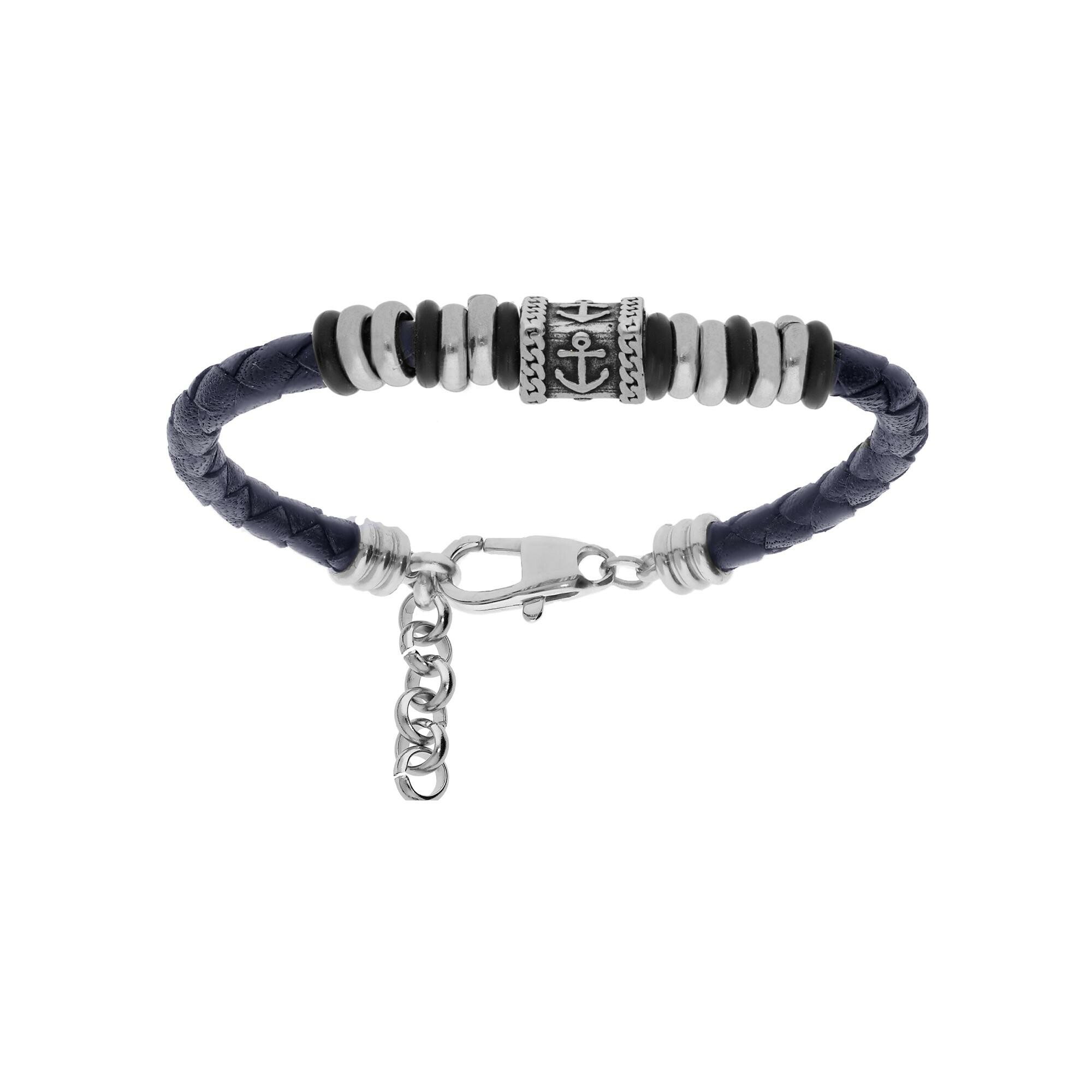 Bracelet acier junior cuir bovin bleu rondelles et motif ancre 16+3cm