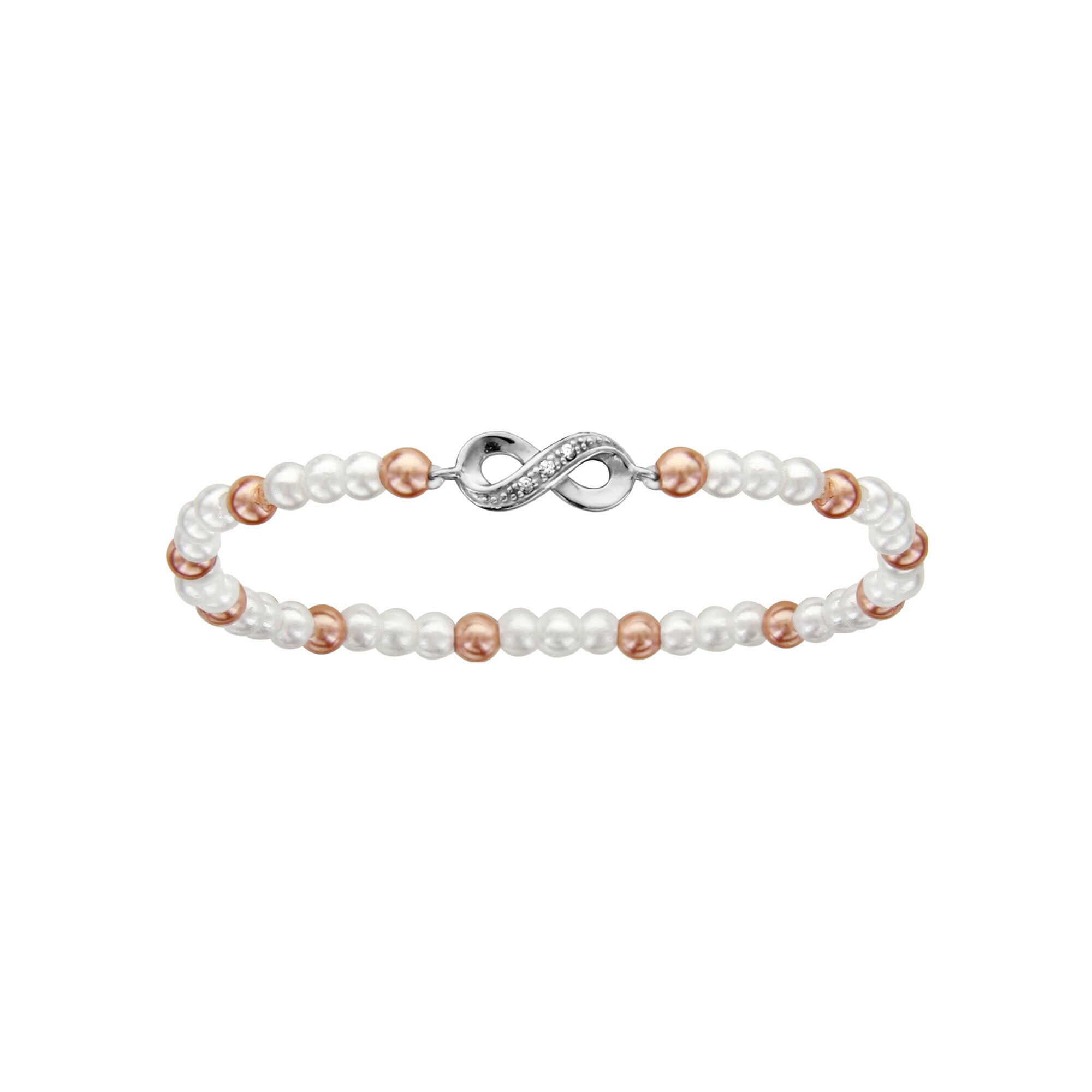 Bracelet enfant elastique perles synthétique blanche et rose motif infini argent rhodié et oxydes blancs sertis